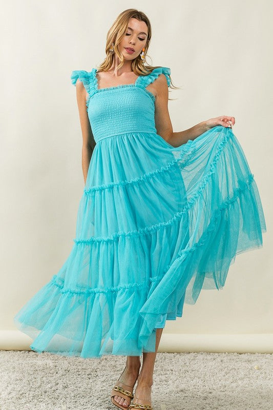 BiBi Frill Mesh Tiered Midi Dress